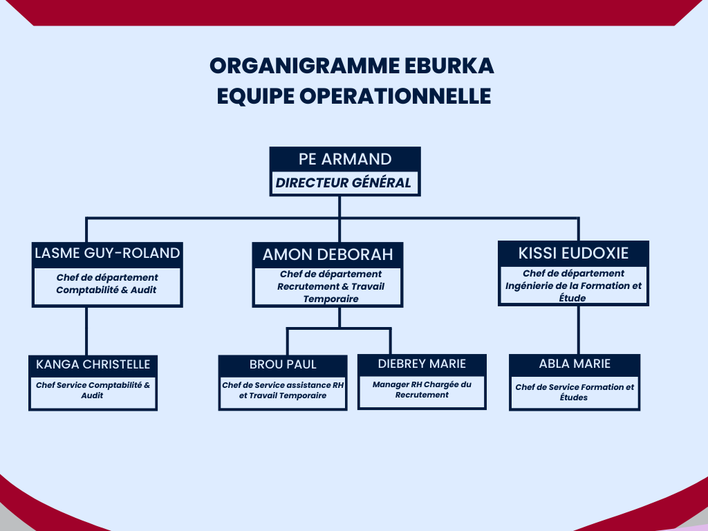 EBURKA Conseils est un cabinet spécialisé en Management et Organisation, en Assistance dans les domaines de la Gestion des RH (Formation et Etudes Projets, Gestion de la Main d’œuvre Travail Temporaire et Recrutement), en Comptabilité et Audit.